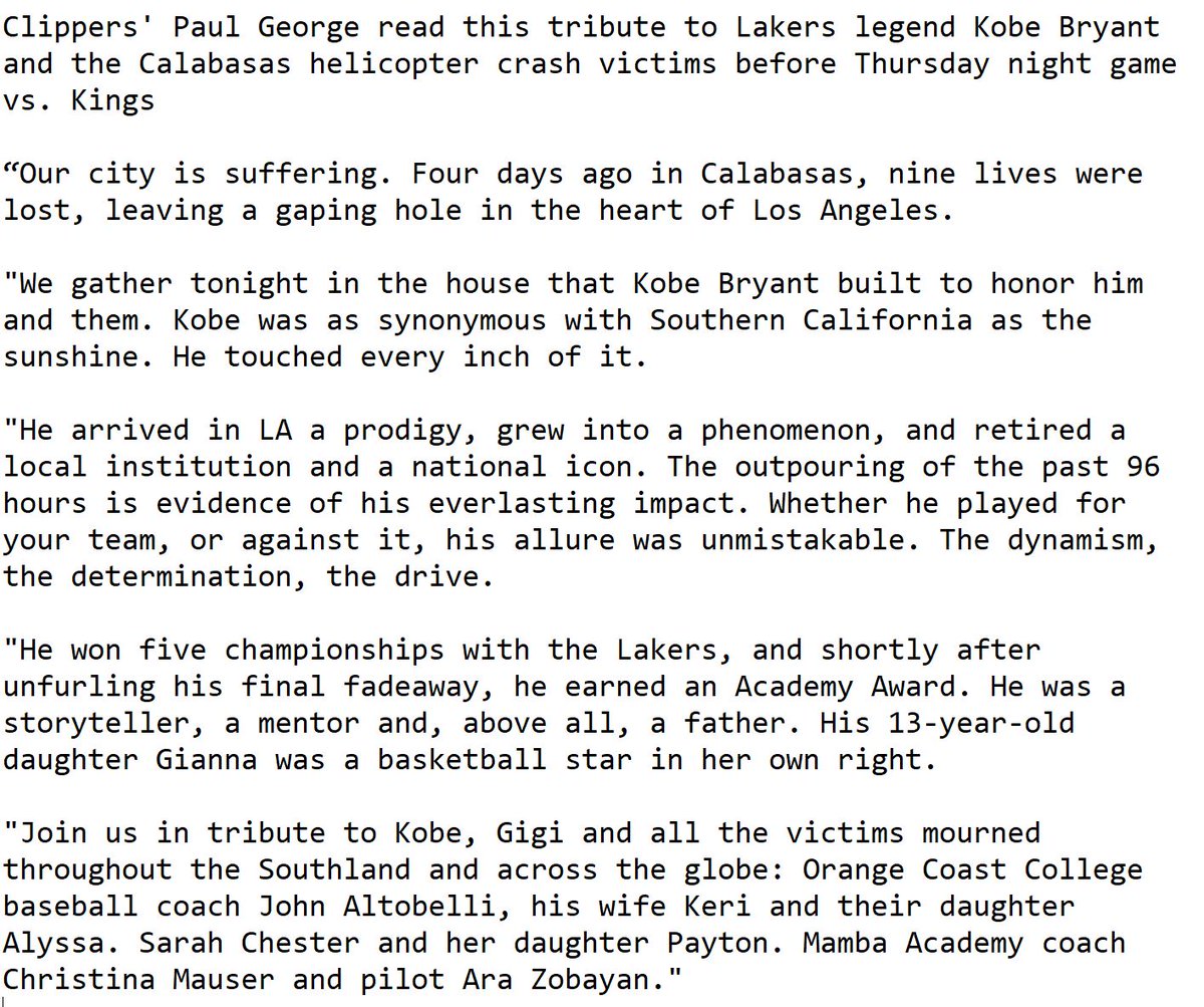 Ben Golliver On Twitter Clippers Paul George Narrated This Tribute To Lakers Legend Kobe Bryant Amp Calabasas Crash Victims Before Game Vs Kings We Gather Tonight In The House That Kobe Bryant